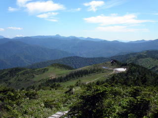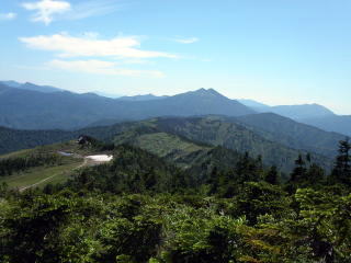 さらに、ブナの茂る尾根道を登り、次に針葉樹のオオシラビソに変り、山頂部から続く湿原の南端に達する。
