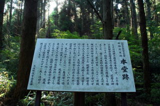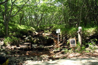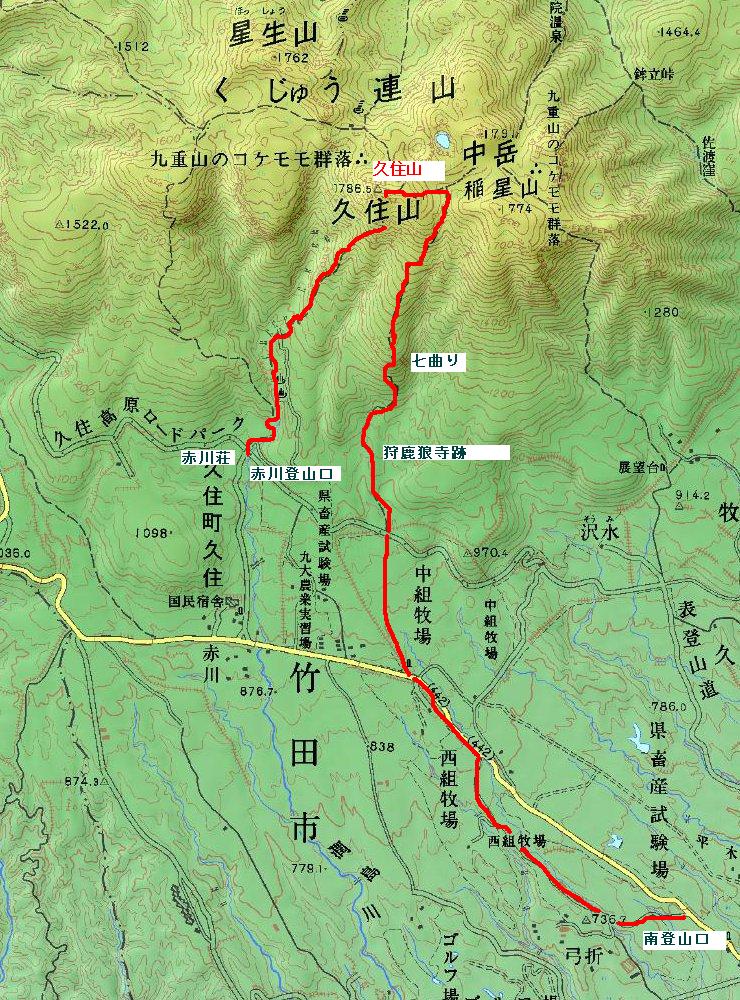 山頂からの大展望を楽しみ、それから東に向かい、久住山と稲星山との鞍部にある神明水の水場から南登山道を下って行った。今は、神明水は水が得られるが、冬場は涸れてしまう。ここから稲星山と中岳に向けて登路が分かれている。 南登山道もまた、久住高原の雄大な景色が満喫できる展望コースである。 ミヤマキリシマの群生が終わるとリョウブやミズナラ、カエデなどの樹林帯に入って入った。七曲と呼ばれるジグザグの道を進み、流れをまたいだら猪鹿狼跡があった。古代から近世に掛けて本堂のあった場所だ。今までは小さな石祠と説明が付いていた。