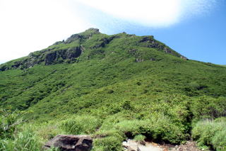 急斜面を進み、ほどなくして見晴らしの良い尾根に着いた。行く手に、久住山がそびえ立ち、南には広々とした久住高原が見えた。 谷ひとつ隔てた肥前ケ城東面の柱状節理もすばらしい。ここからは、胸突くような急斜面の道となった。岩につかまり、よじ登ったりして、ゆっくりと高度を上げて行った。急斜面の道を進み、北の方角に久住山山頂が見えてくると、まもなく久住山山頂の三角点の近くに登り着いた。(経過2時間)。